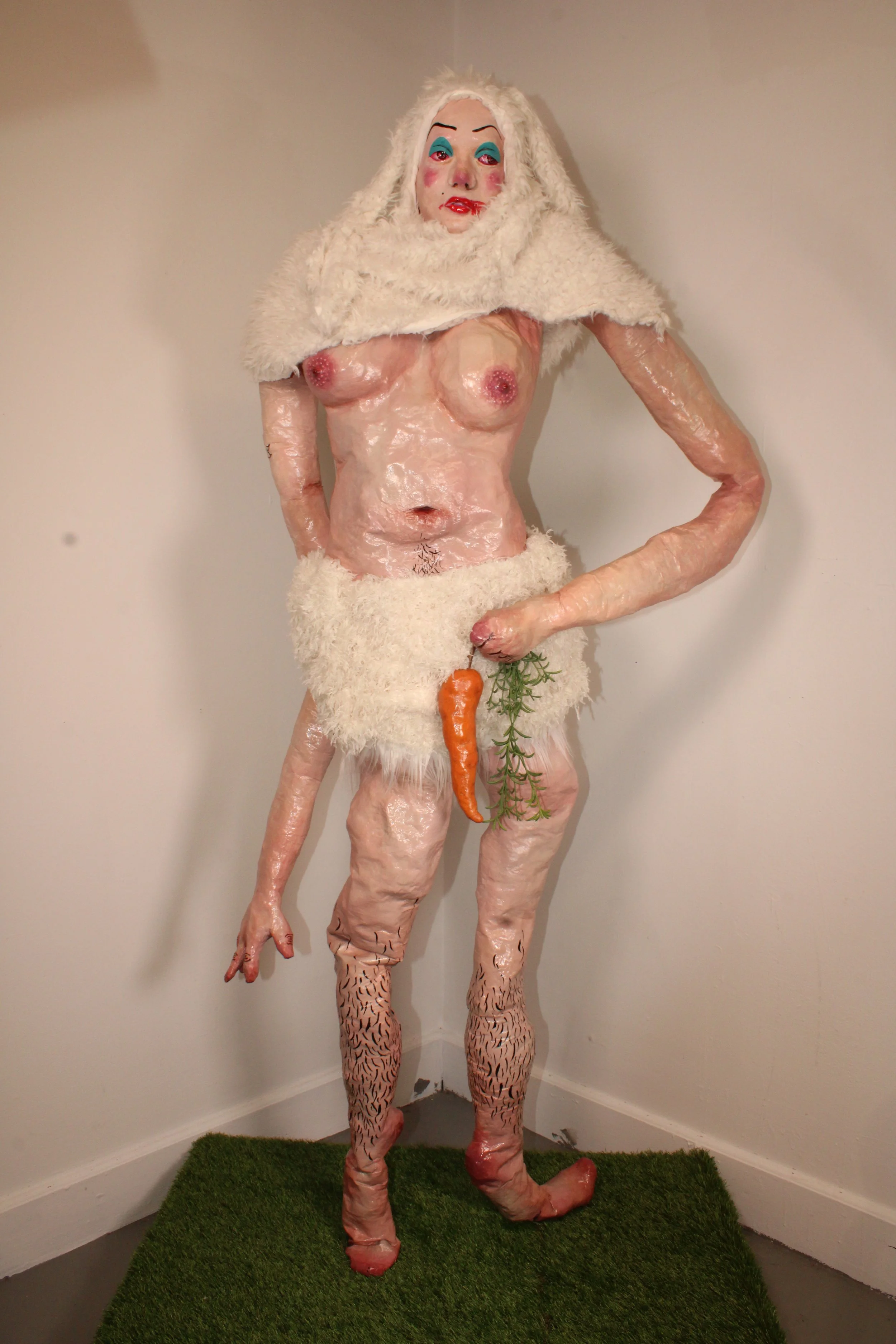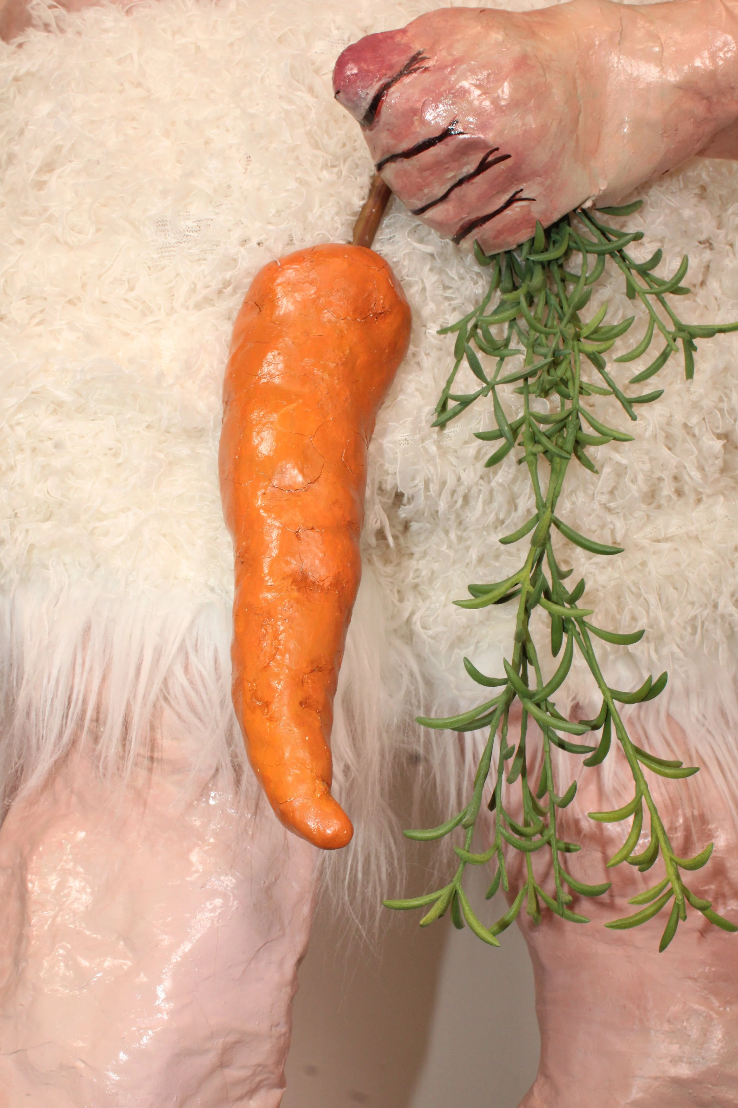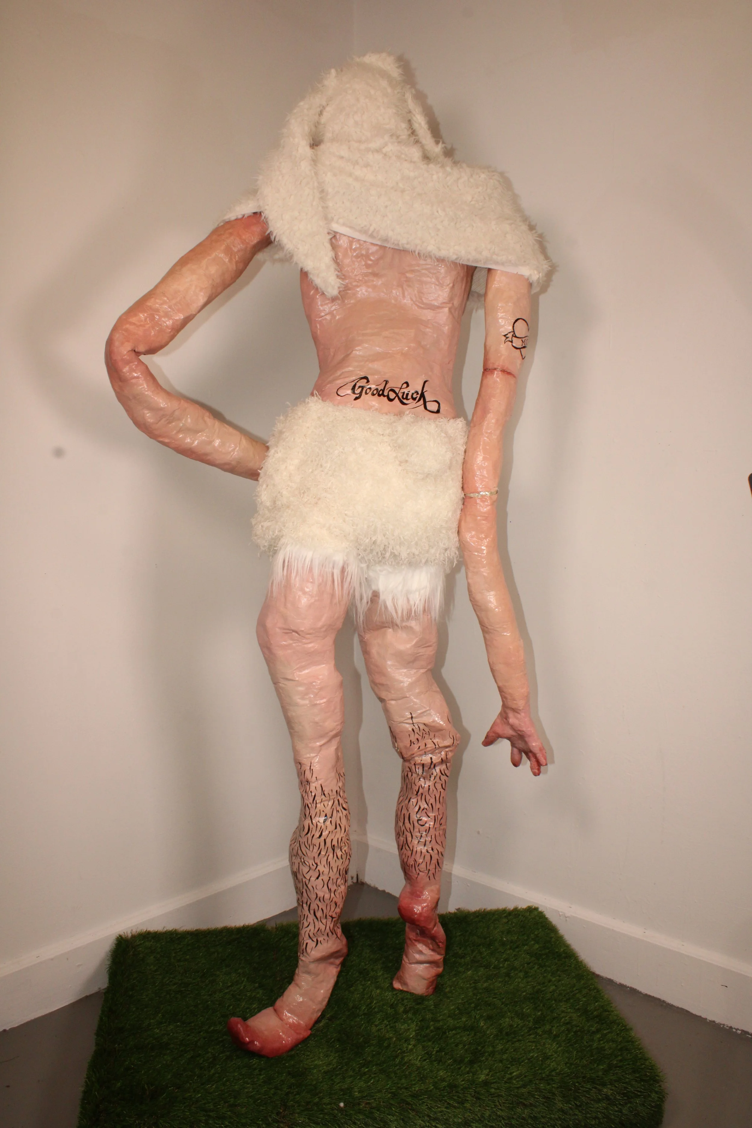 MEDIUM: PAPER MACHE BODY CASTS, CLAY, STYROFOAM, ACRYLIC PAINT, SYNTHETIC PLANT, PLASTIC, GLOSS VARNISH, FABRIC, FAUX FUR, THREAD, WIRE, METAL, WOOD, TURF