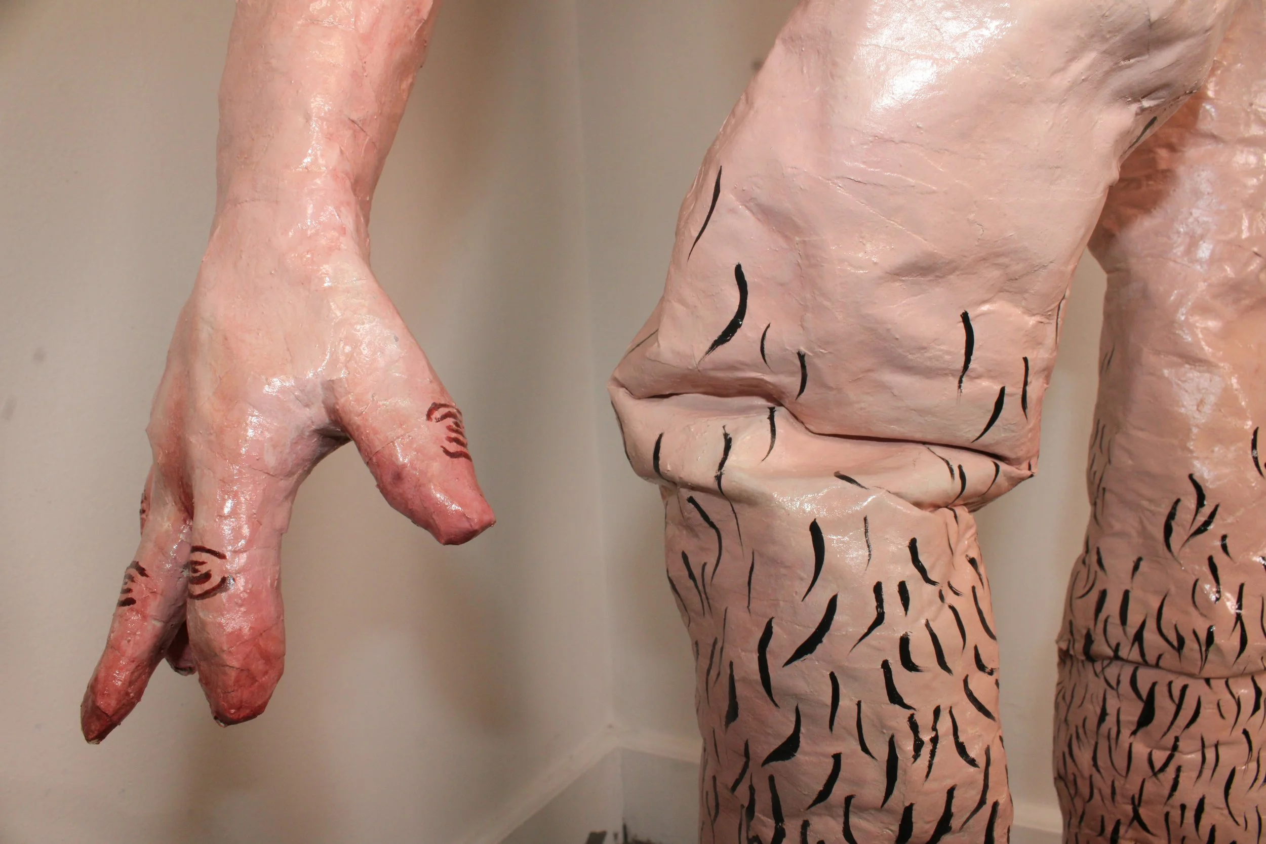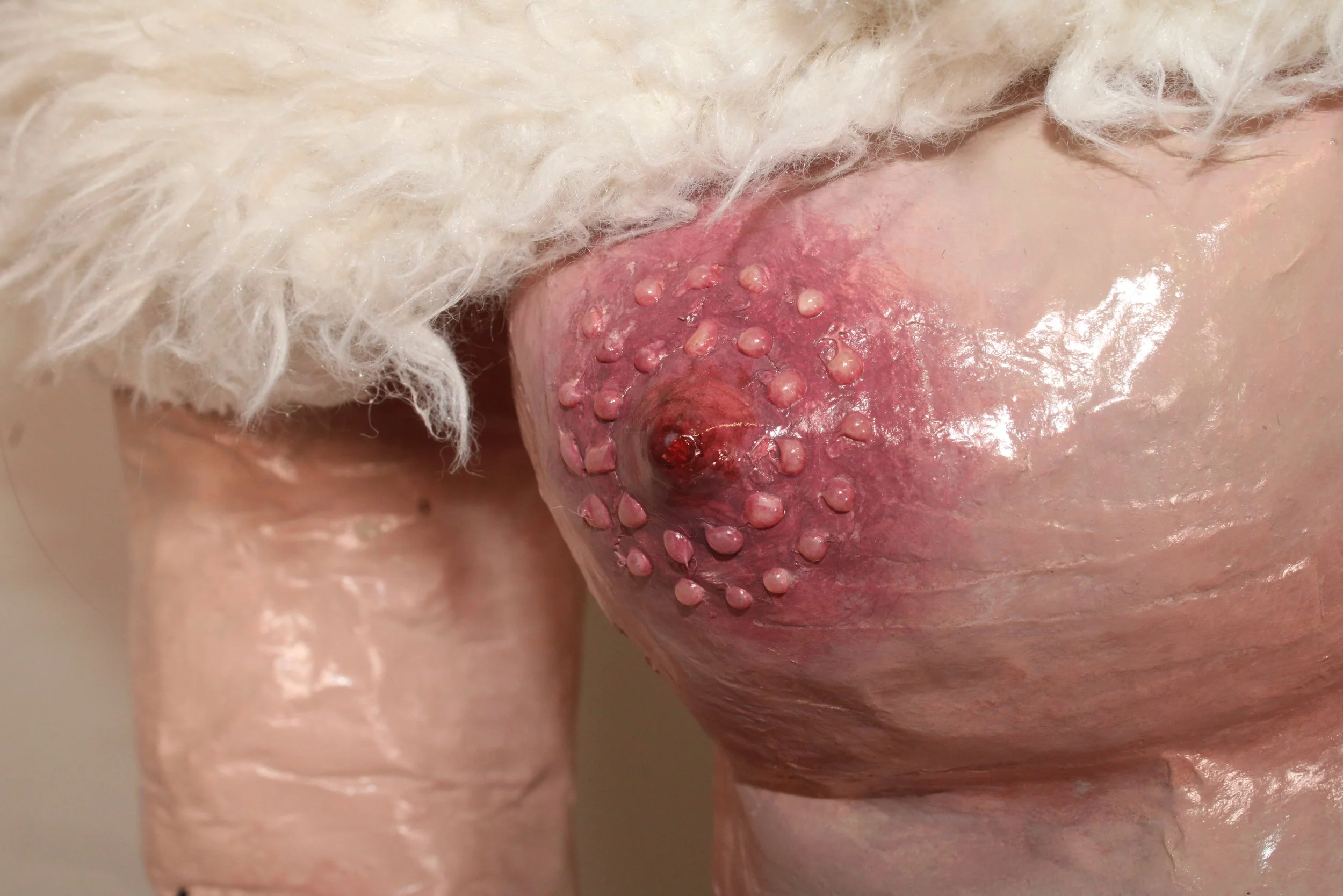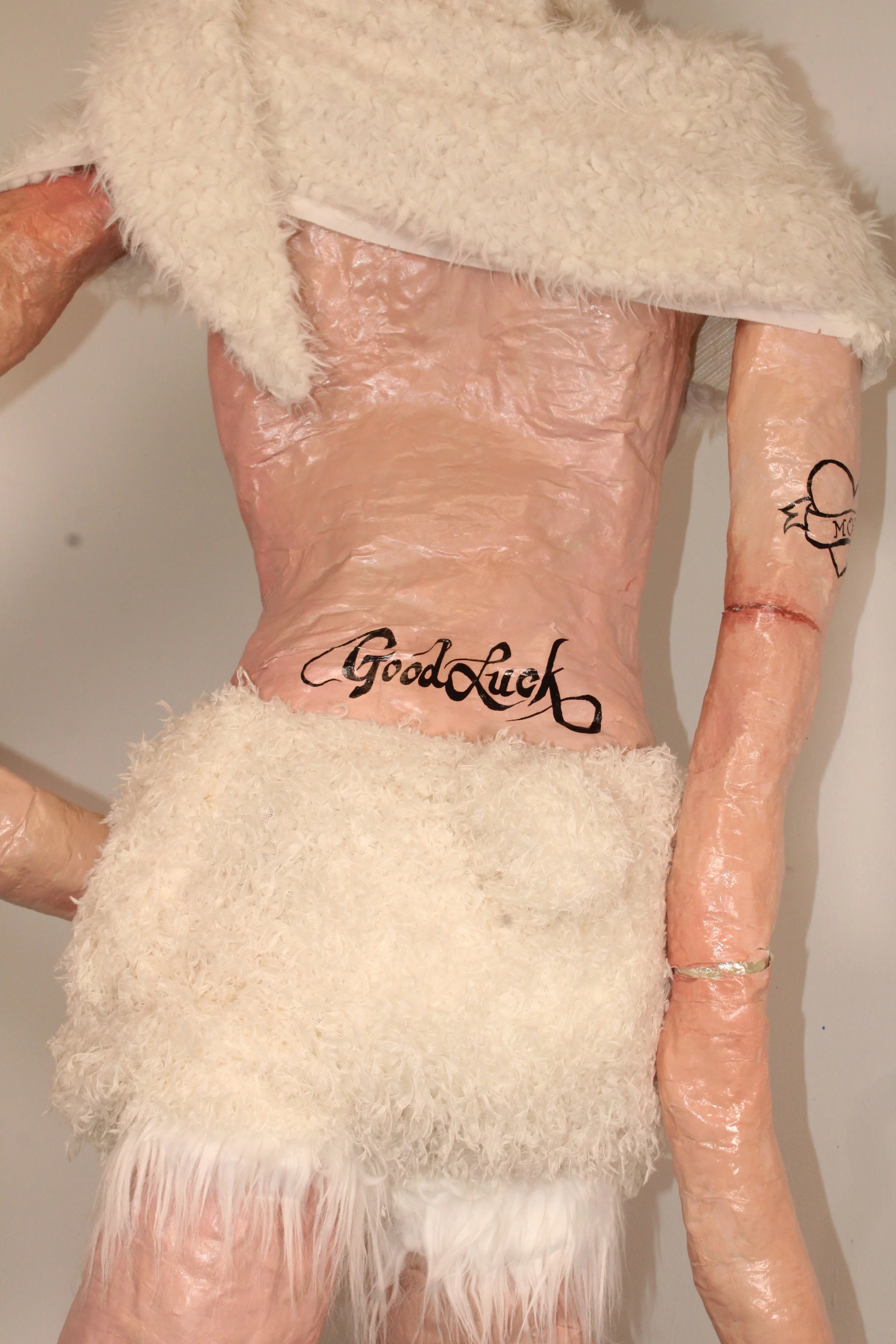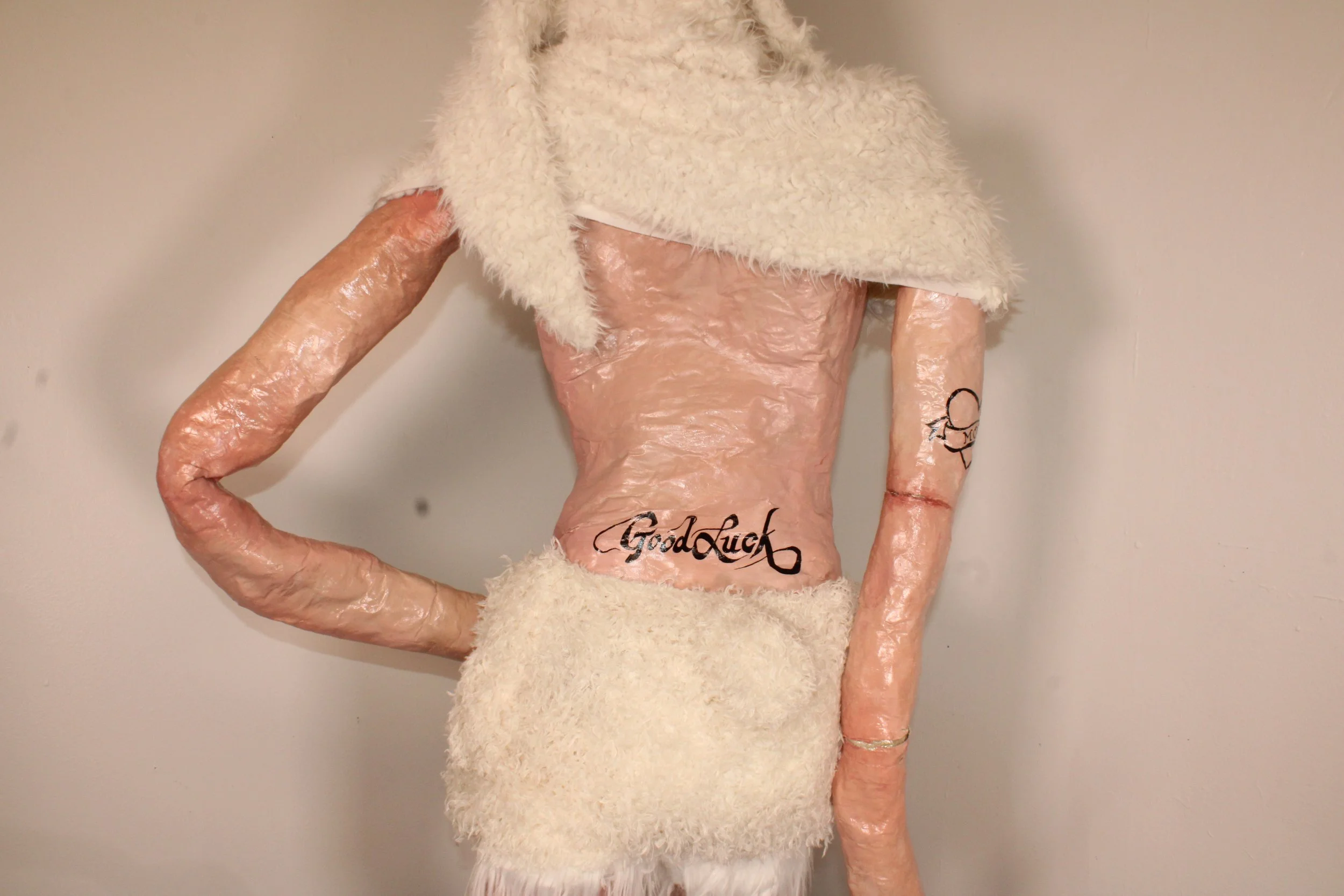 MEDIUM: PAPER MACHE BODY CASTS, CLAY, STYROFOAM, ACRYLIC PAINT, SYNTHETIC PLANT, PLASTIC, GLOSS VARNISH, FABRIC, FAUX FUR, THREAD, WIRE, METAL, WOOD, TURF
