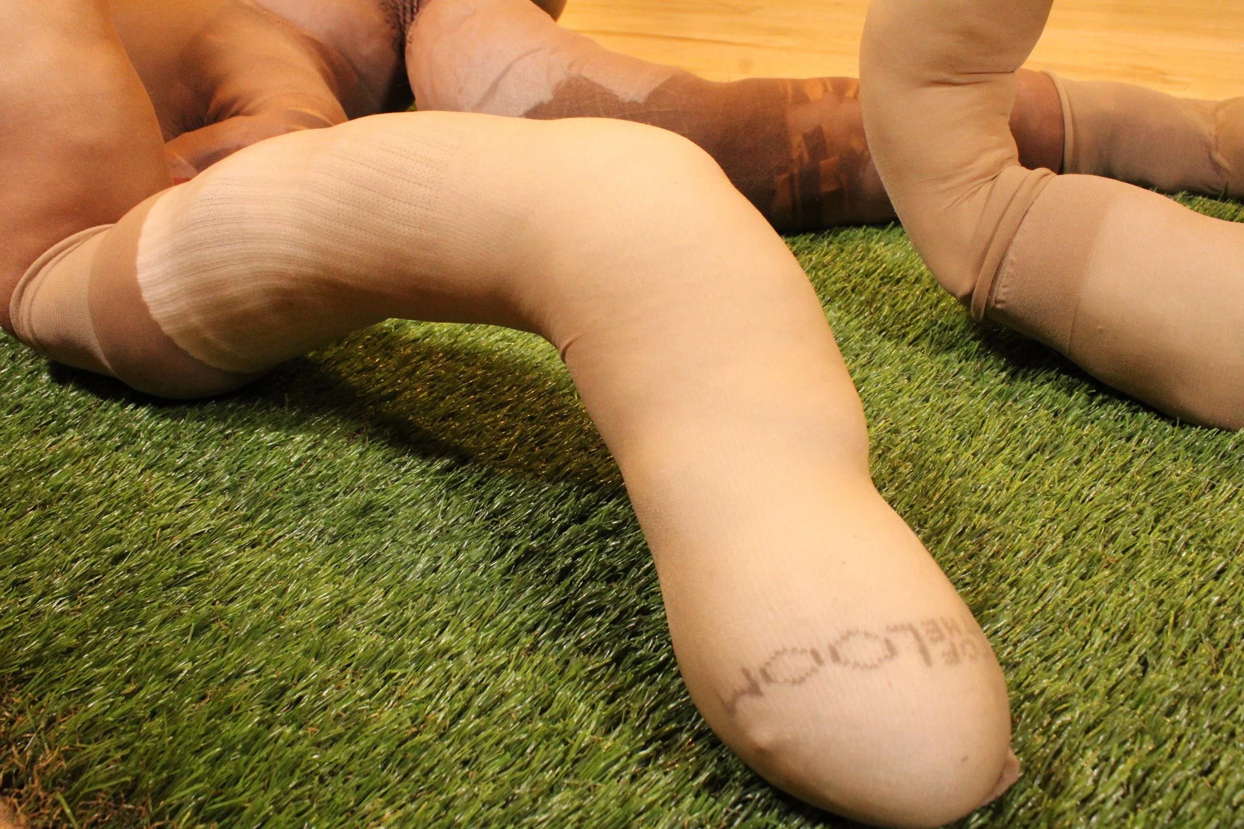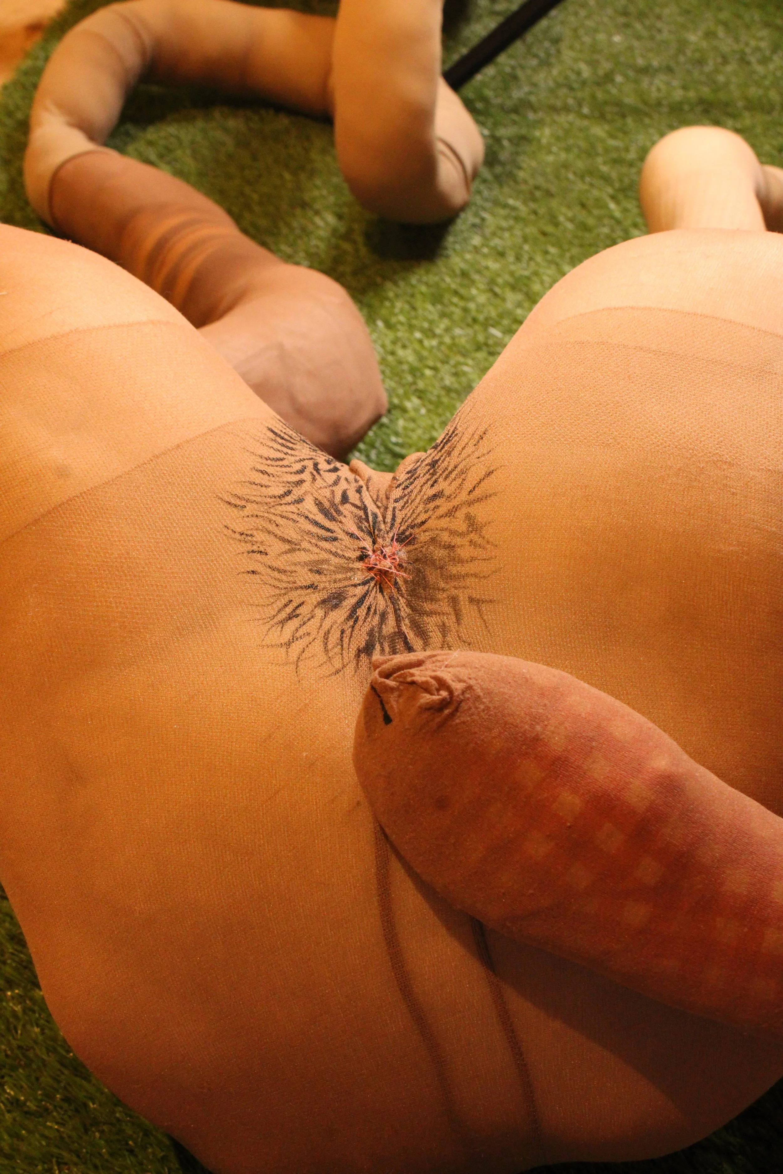 MEDIUM: NYLON, POLYFIL, THRIFTED CLOTHING, SOCKS, THREAD, ACRYLIC PAINT, WIRE, TURF